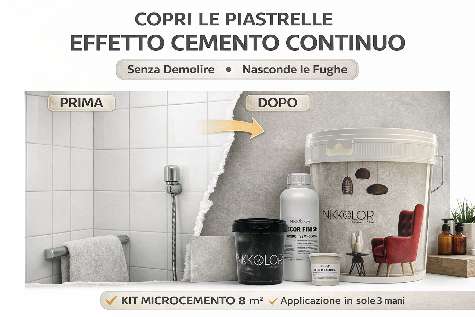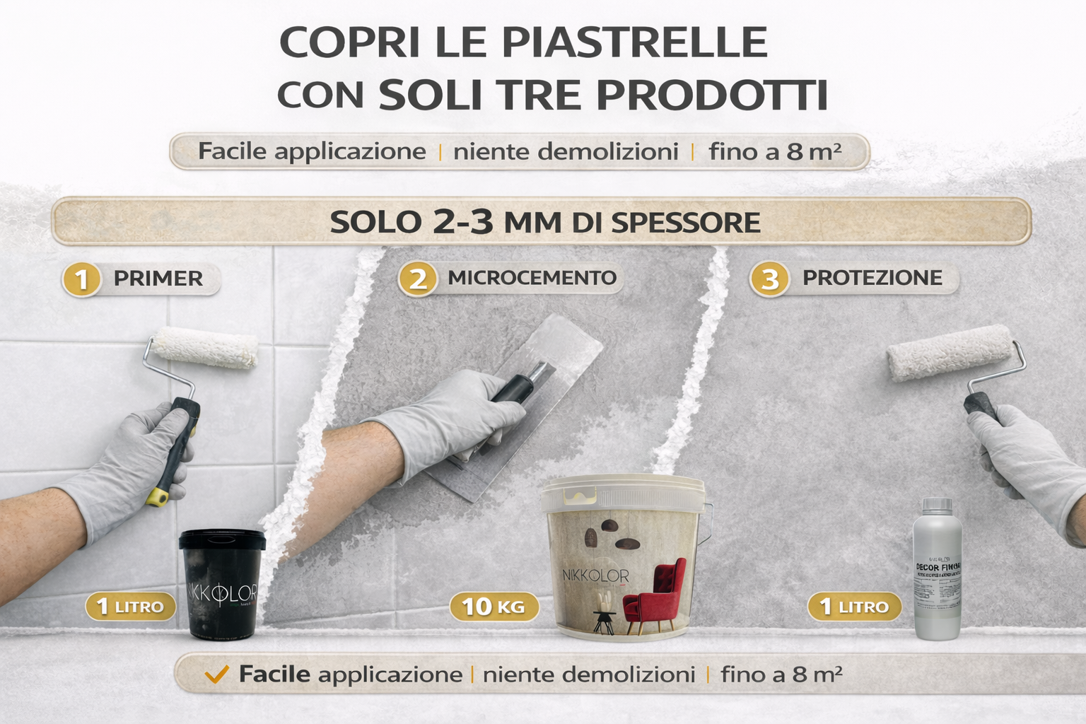 Il kit è progettato per coprire superfici fino a 8 m² e permette di ottenere risultati professionali anche su piastrelle esistenti.