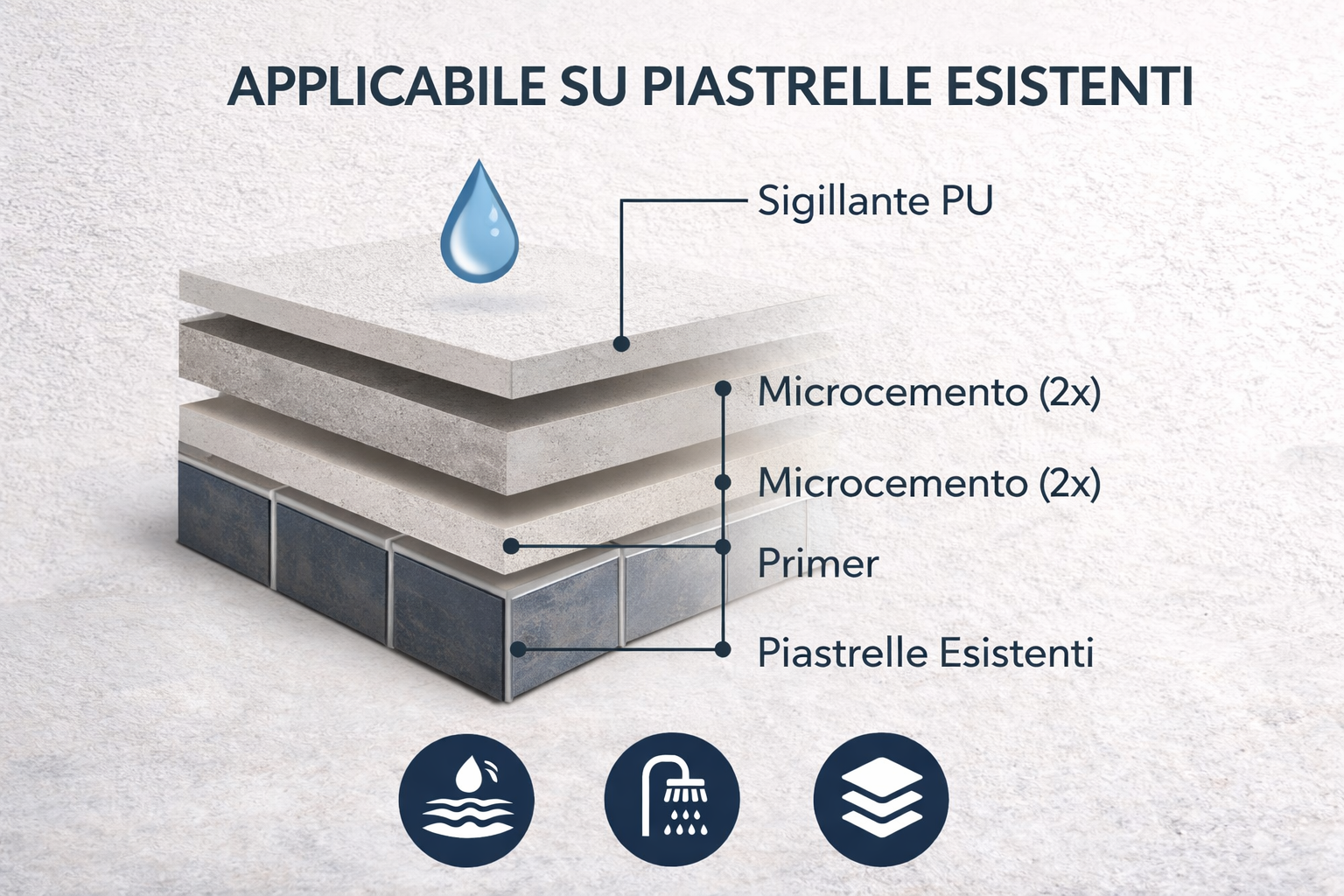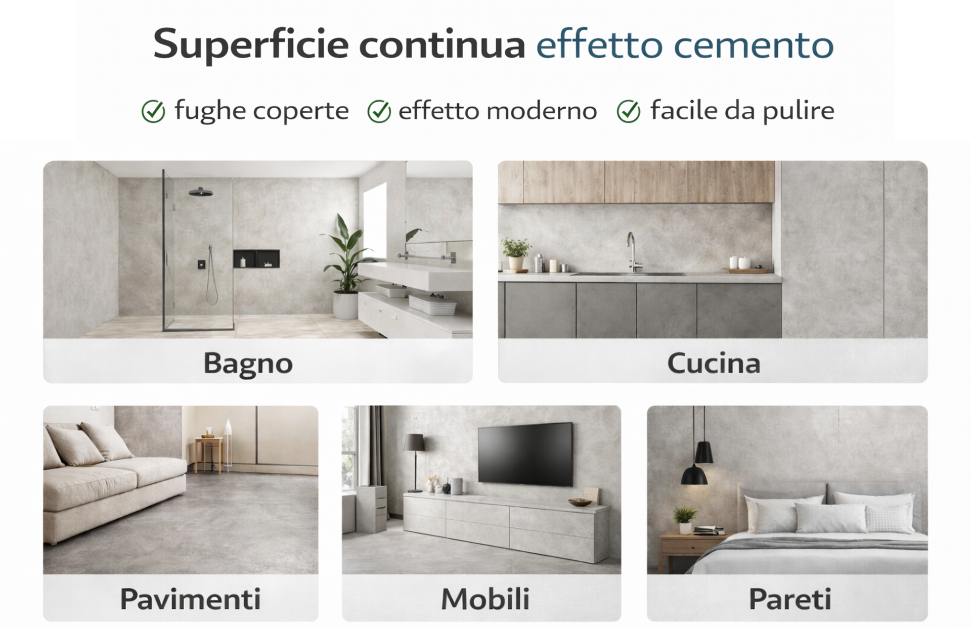 Grazie allo spessore ridotto di soli 2-3 mm, il microcemento crea una superficie continua effetto cemento moderno, eliminando visivamente fughe e giunti.